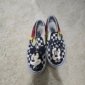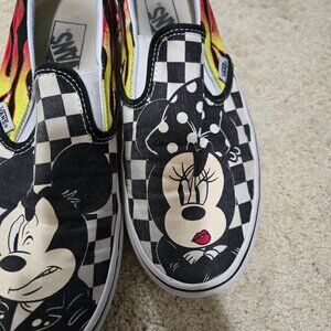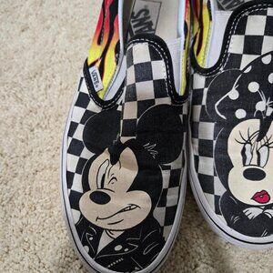 Disney Vans Mickey & Minnie Flame Slip On Sneakers Size 7 Men's 8.5 Women's - great preowned condition, with some wear on the graphic and on the sides and minimal on the soles. No major flaws. Regular preowned wear and tear. Slip on slide on sneakers. Unisex style. Size 7 in men's and 8.5 size in women's. Disney collab with Vans. Classic slip on vans. Canvas upper with some wear, black and white checkerboard color scheme with Mickey and Minnie in greaser leather jackets wear with flames on the sides. Perfect for Grease vibes. Low top. Elastic sides at tongue. Padded collar. Vulcanized outsole.
