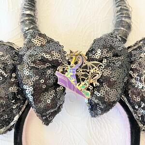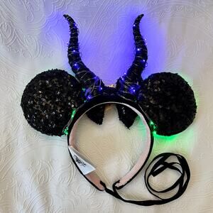 Custom Disney Villains Sleeping Beauty Maleficent ear headband! This black sequin mickey ears headband has been custom altered with sparkling dragon horns and string lights with hidden battery packs. Includes Maleficent dragon pin on the bow!