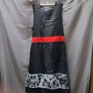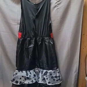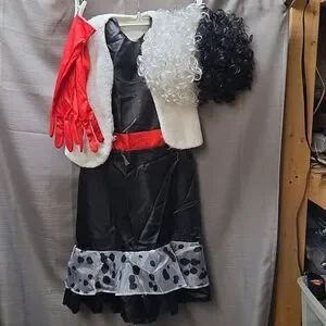 Embrace the villainous style with this Cruella costume. Features a bold black dress with white accents and striking red gloves. Perfect for Halloween fun. Includes a dress XL 14-16. It looks like it would fit a Large instead. The cape is not the original and is smaller. It cones with the dress, gloves and we havecadded a wig.