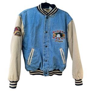 Disney Vintage Mickey Mouse 1928 Varsity "MOM" Embroidered Denim Bomber Jacket
