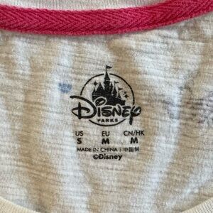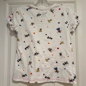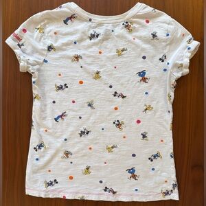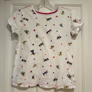 Disney short sleeved T-shirt with white background and adorable pattern of miniature Disney characters including Mickey and Minnie Mouse, Pluto, Goofy and Donald Duck. Ribbed collar, contrasting stitching on shoulders and hem, rolled sleeve cuffs and Disneyland sleeve patch contribute to the charm of this cute tee.