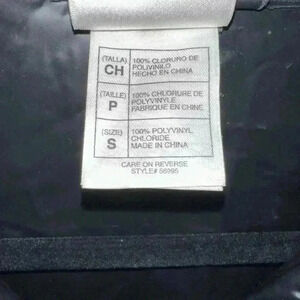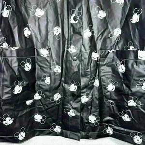 This is a pre-owned Disney Mickey Mouse rain jacket. It is black with a white Mickey Mouse print all over. The jacket has a button closure, two front pockets, and long sleeves. The sleeves have a snap button closure at the cuffs. The jacket is made of 100% polyvinyl chloride and is size S. The jacket is in good condition with no visible imperfections. The brand is Disney and the style number is 56895. The care instructions are to wipe clean with a damp cloth and do not wash.