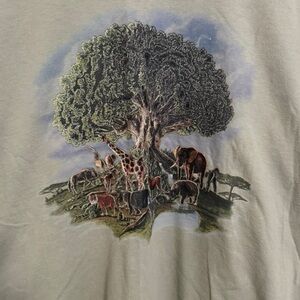 This vintage unisex Disney’s Animal Kingdom T-shirt features a bold 3D puff print graphic of animals gathered around the iconic Tree of Life on the front with “Disney’s Animal Kingdom” text on the back. The muted green color gives it a true Y2K vibe and makes the detailed multicolor print stand out. Tagged size XL and made from a cotton-polyester blend for soft comfort and durability. The tee shows some light wear consistent with age, including cracking in parts of the graphic and peeling, but overall still highly collectible and wearable. A rare find for Disney and vintage graphic tee collectors alike.