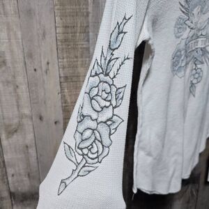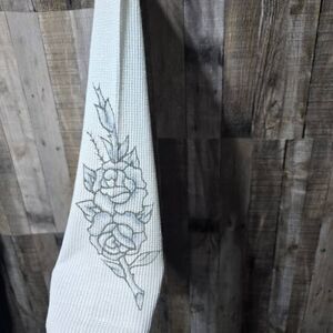 Details: waffle knit, crewneck, graphic front and sleeves, lightweight, fitted