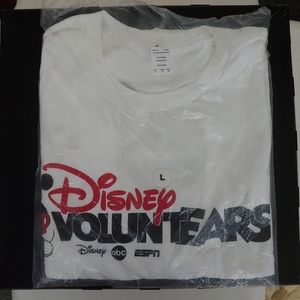 Disney Voluntears (volunteer) white t shirt. Unisex/Men's size large. 100% cotton. First photo stock. New in original plastic bag. Bag is partially ripped open.