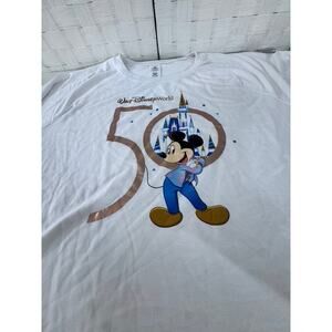 The product is a Disney Walt Disney World 50th Anniversary Mickey Mouse whimsical top in size 2X. This casual top is designed for women and features the iconic character Mickey Mouse. The top is white in color, making it a versatile and fun addition to any wardrobe, especially for Disney fans celebrating the park's anniversary. With its playful design and comfortable fit, this top is sure to bring joy and nostalgia to the wearer.28"T x 23"Pit to Pit x 28.5"Arm