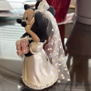 Celebrate your special day with this charming Disney wedding cake topper. Featuring beloved characters in elegant black and white attire, it's a perfect addition to your wedding decor.