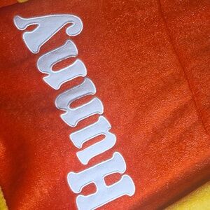 PRE-Owned Winnie the Pooh cozy pullover hooded sleepwear lounger with "Hunny" across the chest and a kangaroo pouch/pocket. Made of 100% polyester with a metallic silver-tone shimmer throughout. ***Missing drawstring around the hoodie. Otherwise in good condition. Tagged size: M (8-10)