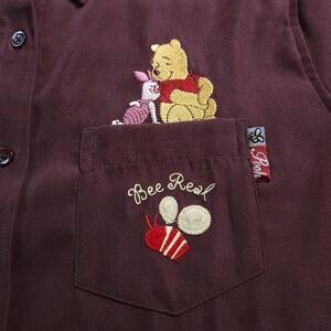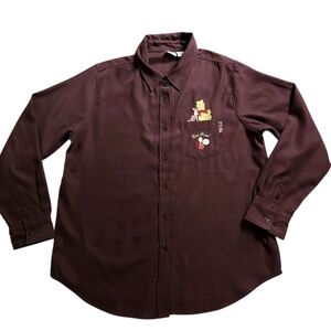 2000s Disney Winnie the Pooh Button Down Shirt Sz Large. Color is a brownish purple. Embroidered Pooh and Piglet, felt bee on the pocket. 100% polyester, has a softer velvety feel to it. little wear on the ends of the sleeves. Don't see any holes or stains. Flat measurements approximately