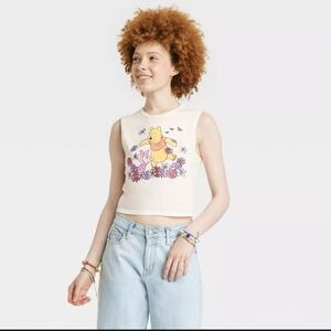 Disney Winnie the Pooh Cropped Ivory Embroidered Tank Top Size Large Juniors