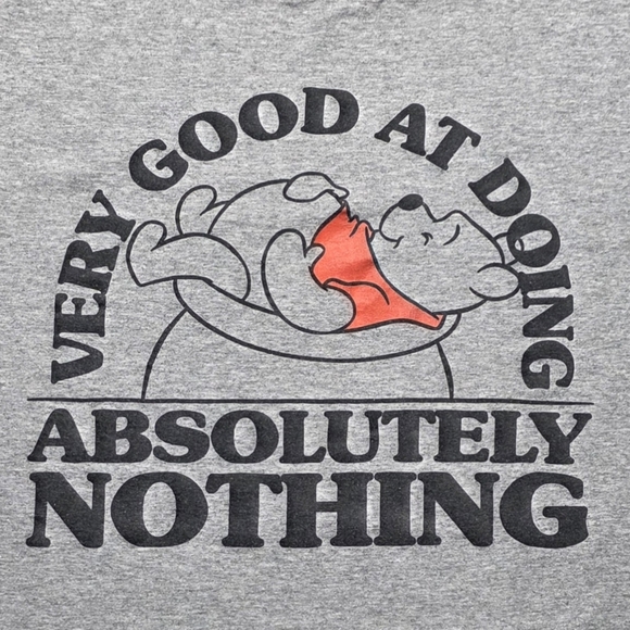 Design: Gray short-sleeve crew neck with a graphic of Winnie the Pooh and the quote: "VERY GOOD AT DOING ABSOLUTELY NOTHING" (Based on the works by A.A. Milne and E.H. Shepard).