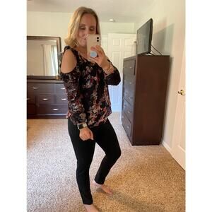 Our floral velvet burnout blouse flaunts ruffled cold shoulders for a delicate sensibility. Wear it with our Coated Skinny Jeans and Embellished Flats for a textured look.