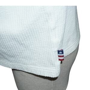 Details: 3-button V-neck, embroidered graphic, patriotic star flag side tag