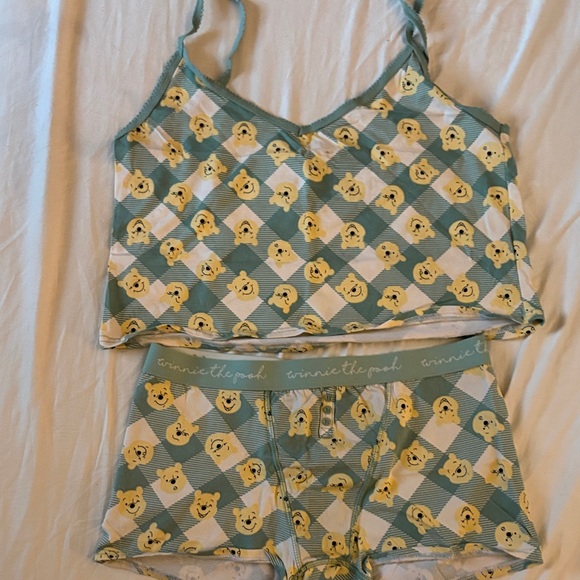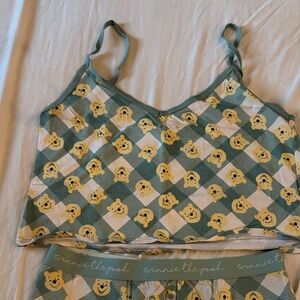 Charming Disney pajama set with Winnie the Pooh design. Features green and yellow checkered pattern. Ideal for a cozy night.