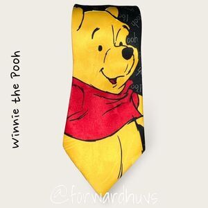This is a listing for a preowned Winnie the Pooh, character tie, which is in good preowned condition. This tie has a large Pooh toward the bottom and has “Pooh” written all over the tie. This is a great piece!