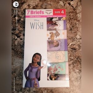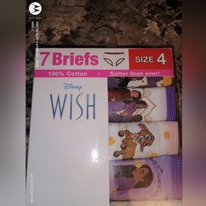 Set of 7 girls' briefs featuring Disney Wish characters. Soft cotton material. Vibrant and playful designs.Disney wish. Seven pair of girls panties size 4 100% cotton softer than ever. All with movie themes on them from the movie wish. Seven pair brand new inbox manufactured by handcraft. Size 4 $6 per box
