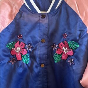 Disney Woman’s Lilo Stich Aloha Pink Blue Bomber Jacket Size 2 XL Embossed