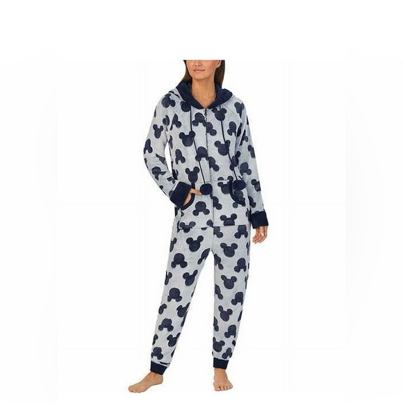Disney Women’s Mickey Mouse Hooded One Piece Fleece Pajama in gray and blue