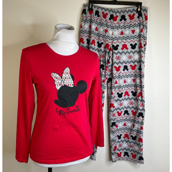 Disney Womens Minnie Mouse 2 Pc PAJAMAS Size Small Fleece Pants RED Gray