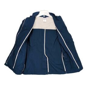 -Features: Full zipper closure with toggle claps placket, armpit gussets, Mickey Mouse embroidered patch, long sleeves, mock neck collar, snap closure pockets, d-ring, back vent, navy blue with contrast stitching