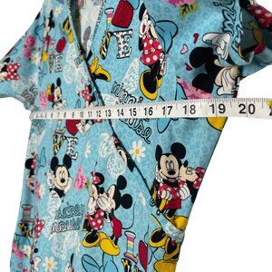 Disney Women's Scrub Top Mickey & Minnie "Call Me Mickey" - blue background, 2 patch pockets on right, 1 pocket on left, V-neck crisscross, gathered in back, short sleeve, side pleats at hem. Pre-owned, very good condition.