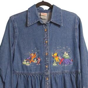 Disney Womens Shirt Dress Blue Denim Long Sleeve Embroidered Winnie The Pooh M