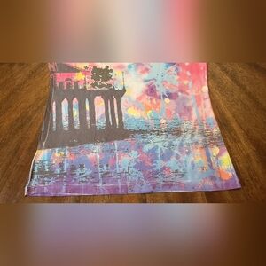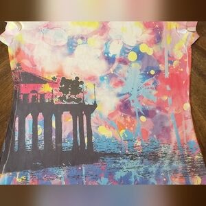 Add a burst of color to your wardrobe with this vibrant Disney Women's T-Shirt featuring Mickey and Minnie Mouse. This eye-catching tee showcases the beloved couple sharing a sweet moment on a boardwalk, set against a mesmerizing, watercolor-inspired background. The all-over print features a kaleidoscope of pink, yellow, blue, and purple hues, creating a dynamic, abstract design that's perfect for any Disney fan.