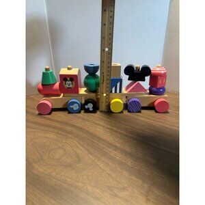Brightly colored Disney wooden stacking train toy featuring Mickey Mouse design. Includes detachable train cars and various stackable shapes. Fun and educational play with sturdy wooden construction.