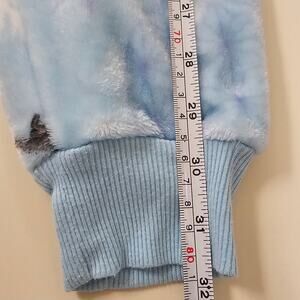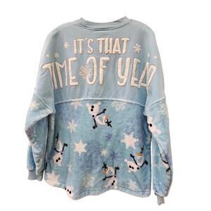 From Disney and Walt Disney World 50 Collection by Spirit Jersey, this jersey features Olaf, the Snowman from Frozen. The top section of the jersey is light blue cotton with screen printing that says, "Epcot International Festival of the Holidays 2021" on the front, and "It's That Time of Year" on the back. The bottom half of the jersey is fuzzy fleece, featuring Olaf and snowflakes. The inside of the shirt feels like French terry. The shirt is designed to have a very boxy feel. It is in EXCELLENT CONDITION! Size L.