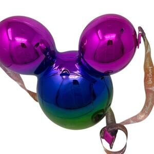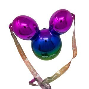 Bring the magic of Disney home with this collectible Disney World Magic Kingdom popcorn bucket. Designed in the shape of the iconic Mickey Mouse balloon, this metallic rainbow bucket features vibrant shades of purple, blue, and green with a matching detachable strap. Perfect for carrying snacks in the park, displaying as a collector’s item, or gifting to a Disney fan. Lightweight and fun, it’s a must-have for parkgoers and collectors alike.