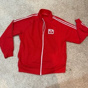 Add a pop of vintage-inspired Disney style to your wardrobe with this bold red zip-up track jacket! Featuring the classic Mickey Mouse globe logo patch on the chest and subtle “Disney World” text embossed throughout the fabric, this jacket combines sporty flair with nostalgic charm.