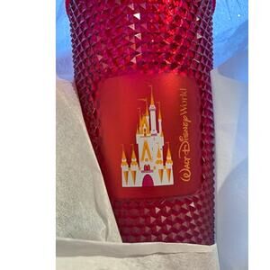 Limited edition Disney Parks Starbucks red Christmas holiday tumbler featuring Cinderella's Castle on one side and the Starbucks logo on the other.