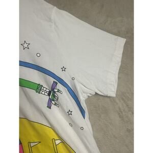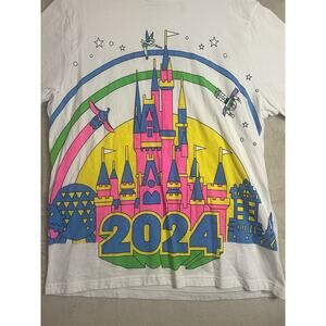 The product is a men's XL shirt featuring Cinderella's Castle from Disney World Parks, with a bright neon design. Released in 2024, this officially licensed Disney apparel is suitable for adults of any gender. The white shirt showcases the iconic castle theme from the beloved Disney franchise, making it a must-have collectible for fans of Disneyana. Perfect for adding a touch of magic to any Disney enthusiast's wardrobe.