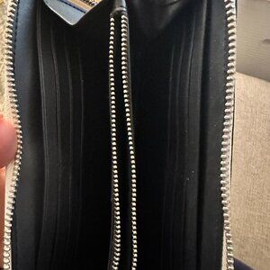 This limited edition Disney X Coach Accordion Zip Wallet is a must-have for any fashion-forward woman. The wallet features a stunning Cinderella Flying Birds Print on a full-length bill compartment, surrounded by smooth leather and printed coated canvas. The zipper closure and credit card slots add a touch of practicality to the beautiful design. The wallet is perfect for Disney fans and collectors, with the iconic Cinderella Flying Birds and other Disney characters adorning the pages. The multi-colored Sv/Chalk design is eye-catching and unique, making it a statement piece that can be paired with any outfit. Get your hands on this stunning wallet and show off your love for Disney X Coach.