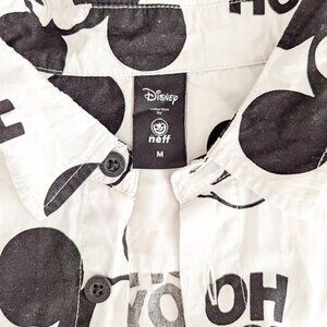 Disney X Neff Mickey Mouse Oh Boy Black & White Mens Button Shirt size MED VGUC. One Mickey head on the back has a mark under his nose as pictured. SO cute and comfy on. We used it for Disney and it was perfect! Breathable and on brand for having fun.