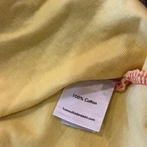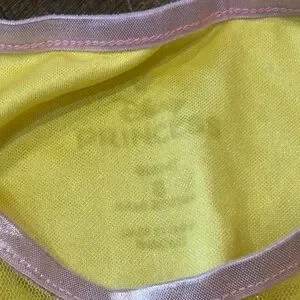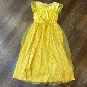 Soft yellow princess nightgown with short puff sleeves. Satin bodice with Belle motif. Pink trim at waist and neckline. Flowing yellow skirt with floral sparkly overlay. Comfortable for bedtime and pretend play.