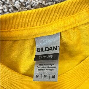Bright yellow Disney tee featuring a playful castle graphic. Perfect for Disney enthusiasts.