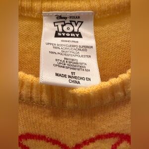 Official Disney Pixar Toy Story Jessie dress costume. This super cute dress is size 5T. Has a yellow knitted top with Jessie's signature red squiggles and belt design. Skirt has a fun cow print tulle overlay with blue tulle underneath. Great for dress-up, Halloween fun, and themed day at school!