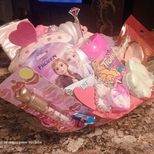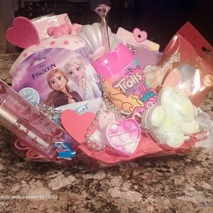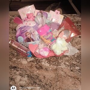 Charming gift set featuring Disney and Trolls items. Includes heart-shaped accessories and colorful stationery. Perfect for fans and special occasions. trolls Disney princess custom birthday gift basket includes loofah's nail polishes candy princess bath bombs body wash lip gloss nail polishes bath fizz coloring books stickers planners stuffies and more