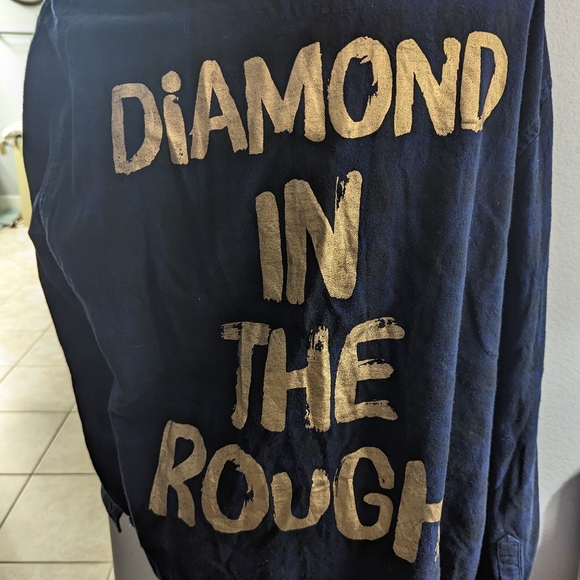 RARE, Disney diamond in the rough cakeworthy button down. Navy and black plaid, has a small whitish stain in the front left side of the shirt. Not that noticeable. The shirt has some wear/fading, bought from a previous owner, but hung dried when I received it. Comes from a smoke-free home but I do have two Frenchies. Please check out my other listings. Thank you.