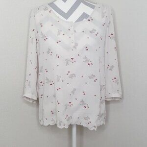 Very good used condition blouse from Lauren Conrad’s Disney Collection. Features a cream sheer colored blouse adorned with Thumper and burgundy flowers. Size medium. No holes, rips or stains.