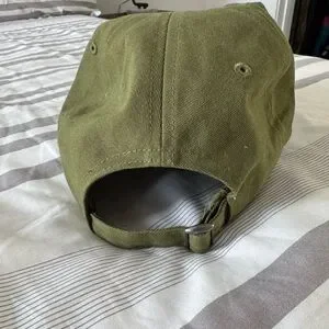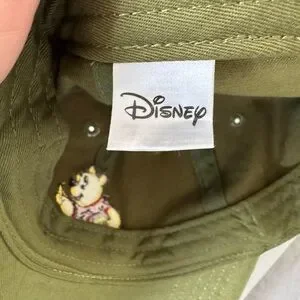 Disney baseball cap featuring Winnie the Pooh embroidery. Olive green fabric with bright yellow and red stitched details. Soft casual style for everyday wear. Iconic character accent.