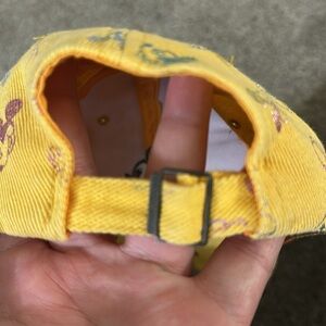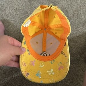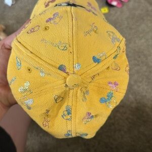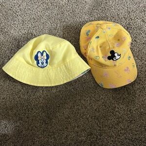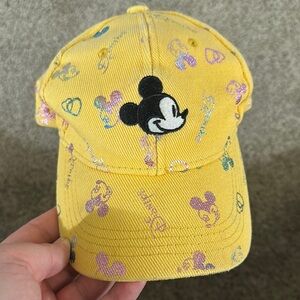 Vibrant yellow cap featuring Mickey Mouse. Includes playful colorful designs and reversible bucket hat. There is writing on the bucket hat tag. In great condition.
