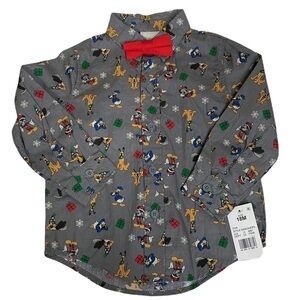 Cute holiday shirt with Mickey Mouse, Goofy, Donald Duck and Pluto. Mickey wedding a Santa hat. Cute red bow tie. Great for holiday photos. 18M