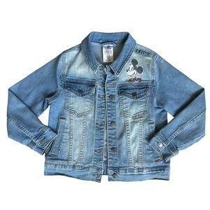This light wash jean jacket features a classic button front, two chest pockets, and a fun embroidered Mickey graphic with his name in red stitching. Perfect for layering year-round! Gently worn and in very good condition — no stains or rips.