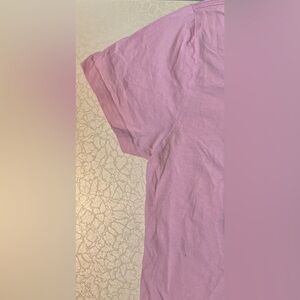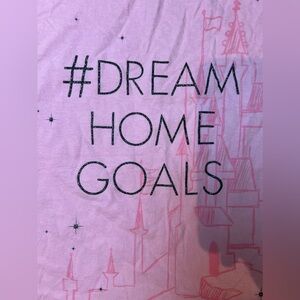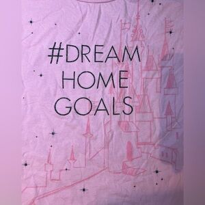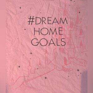 Womens official Disney, U/crew neck tee. Short sleeves. It has Cinderellas Castle screened on front and, “#DREAM HOME GOALS”. The print is glittery blackish-silver with small stars. The shirt has a very faint stain on lower front and lower back. Very faint. See pics.