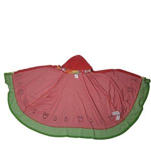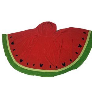 Disney mickey mouse watermelon hooded towel for kids size 5/6 beach pool bathtime. There is a snap button at the beck to hold the towel shut. Super cute and perfect for summer.
