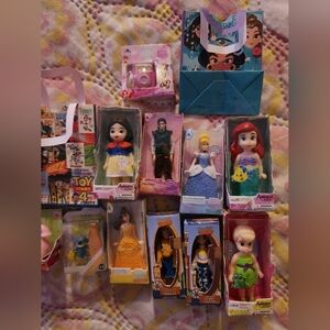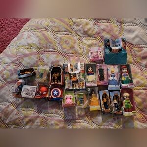 mini baby Ariel doll, mini baby tinkerbell doll, mini Cinderella doll, mini princess bell doll, mini Flynn rider doll, mini disney snap and go play camera mini sheriff woody, mini Jessie the modeling cowgirl, mini bullseye roundup, a mini rare golden lightening McQueen, mini baby snow white doll, mini star wars toybox Millennium falcon, mini marvel toybox captain America figure, mini captain America shield, mini spiderman mask, mini mickey mouse clubhouse Minnie telephone,
