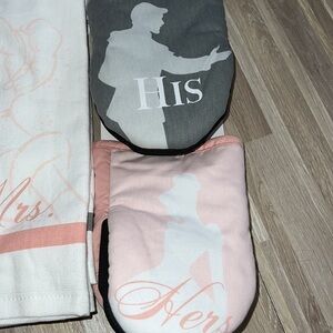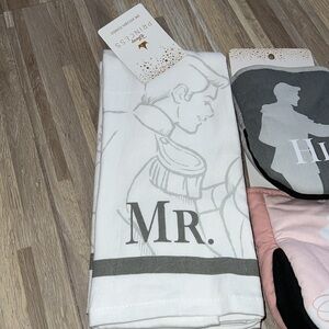 Brand new with tags from the Disney princess collection! Featuring Disneys Cinderella this Kitchen set includes a 2 pack of mr. And mrs. dish towels and his and her oven mitts!