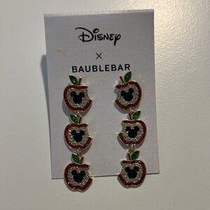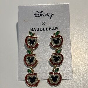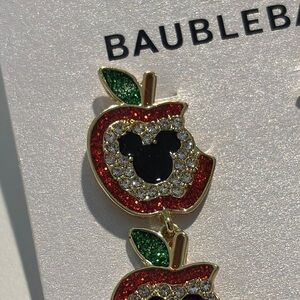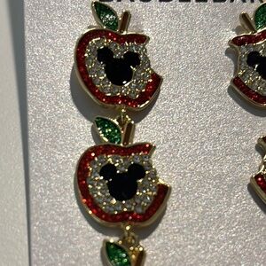 Charming apple earrings with Disney theme. Features red, black, and green accents.